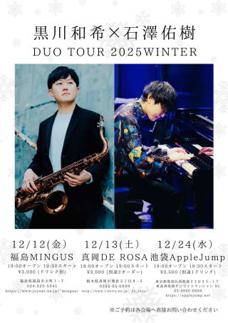 「黒川和希&石澤佑樹」 12月12日(金) 19時開場19時30分開演 前売り・予約¥3.000(ドリンク別) 黒川和希(サックス)石澤佑樹(ピアノ) 黒川和希は、福島大学JAZZ研で、 当店を手伝いながら努力して、 2018年山野ビッグバンド慶応大学 の応援・助っ人として参加し、その年 の「最優秀ソリスト」日本一になりました。 その実力を買われ今は、渡辺貞夫オーケストラ |